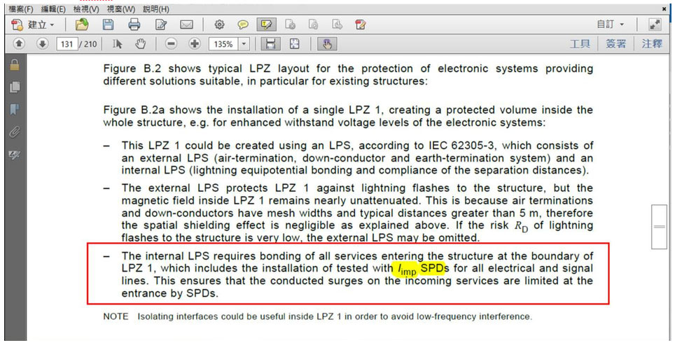 1.) 依IEC62305-1,戶外區代稱為LPZ0( Lightning Protect Zone 0),在進入戶內後依續稱為LPZ1, LPZ2,終端設備為LPZ3; 如下圖